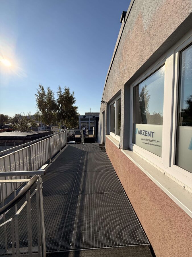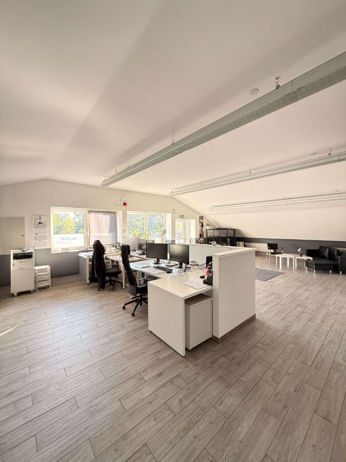 Die hier angebotene Gewerbefläche befindet sich in der oberen Etage einer Gewerbehalle mit Runddach. Die Einheit wurde 2016 komplett hochwertig saniert und wird noch von einer Personaldienstleistung genutzt. Sie verfügt über einen separaten Eingang und ist sehr geräumig. Durch die Fensterlage zur Südseite, ist die Bürofläche sehr hell und freundlich.