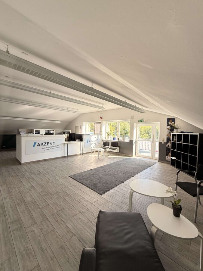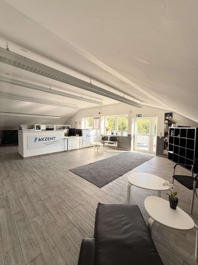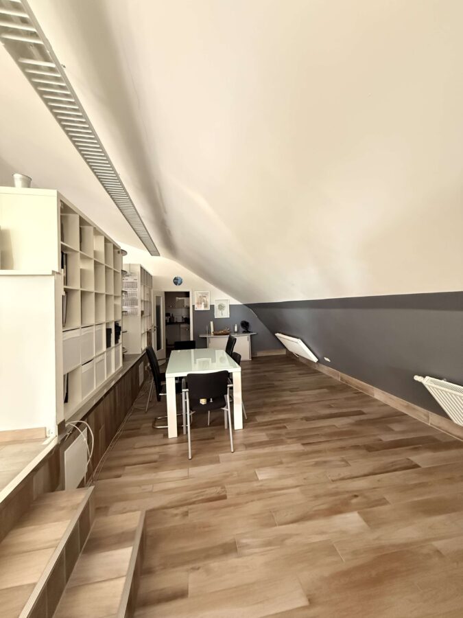 Der Hauptbürobereich ist auf einem Podest gelegen. Aktuell nutzen die Mieter eine tiefergelegene Seite als Aufenthaltsbereich, da dahinter die Küche mit Einbauküche liegt.