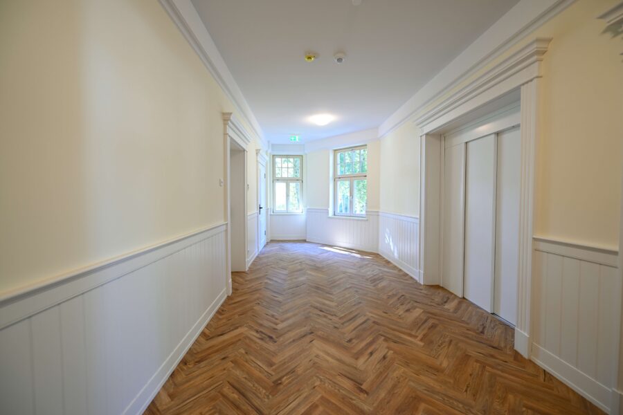 Hier angeboten wird ein barrierefreies 1-Zimmer-Apartment in einem liebevoll kernsanierten, denkmalgeschützten Gutshaus. Die stilvolle Wohnung überzeugt mit einem modernen Bad samt ebenerdiger Dusche, hochwertigem Echtholzparkett in Fischgrätenoptik und einer angenehmen Fußbodenheizung.