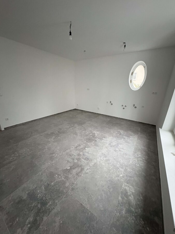 Die Küche ist separate und eignet sich hervorragend als Wohnküche. Im großformatig gefliesten Badezimmer befindet sich eine ebenerdige Dusche.